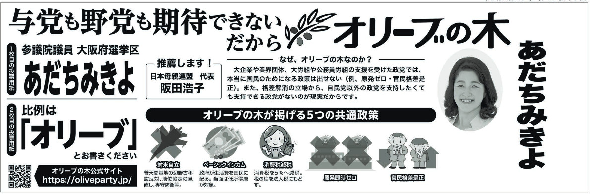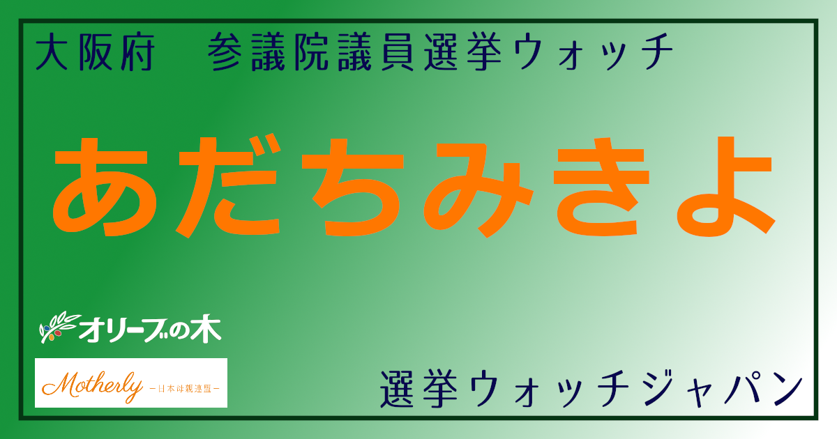 足立候補は元来、これもまた政治団体である「日本母親連盟 マザリー」のかたであり、オリーブの木と母親連盟の共同候補として今回立候補している。