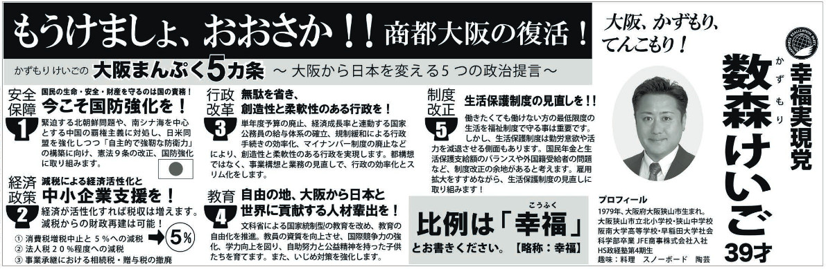 経歴: 大阪狭山市出身。早稲田大学卒。数森氏は前回の参院選や、2017年の衆院選にも出馬。宗教法人・幸福の科学を支持母体とする幸福実現党の大阪本部副代表 兼 大阪府統括支部長。